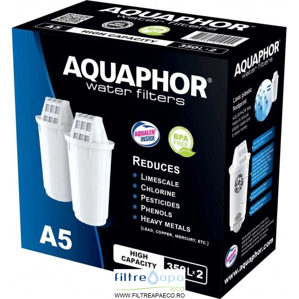 Cartusul A5 este confectionat din carbune activ de nuca de cocos, argint si fibre de Aqualen, ce elimina din apa potabila clorul activ, metalele grele, produsele petroliere, fenolul, pesticidele. De asemenea, ajuta la reducerea duritatii excesive a apei.